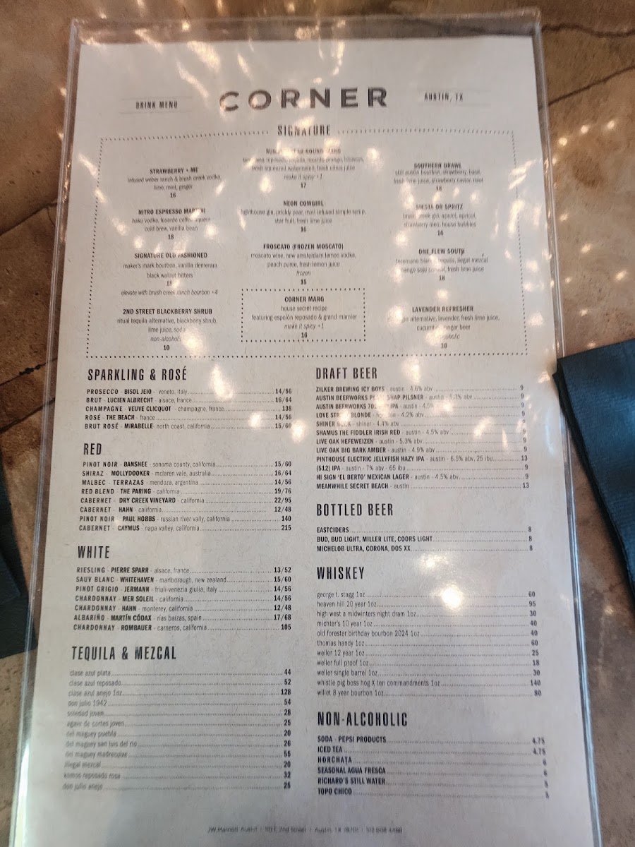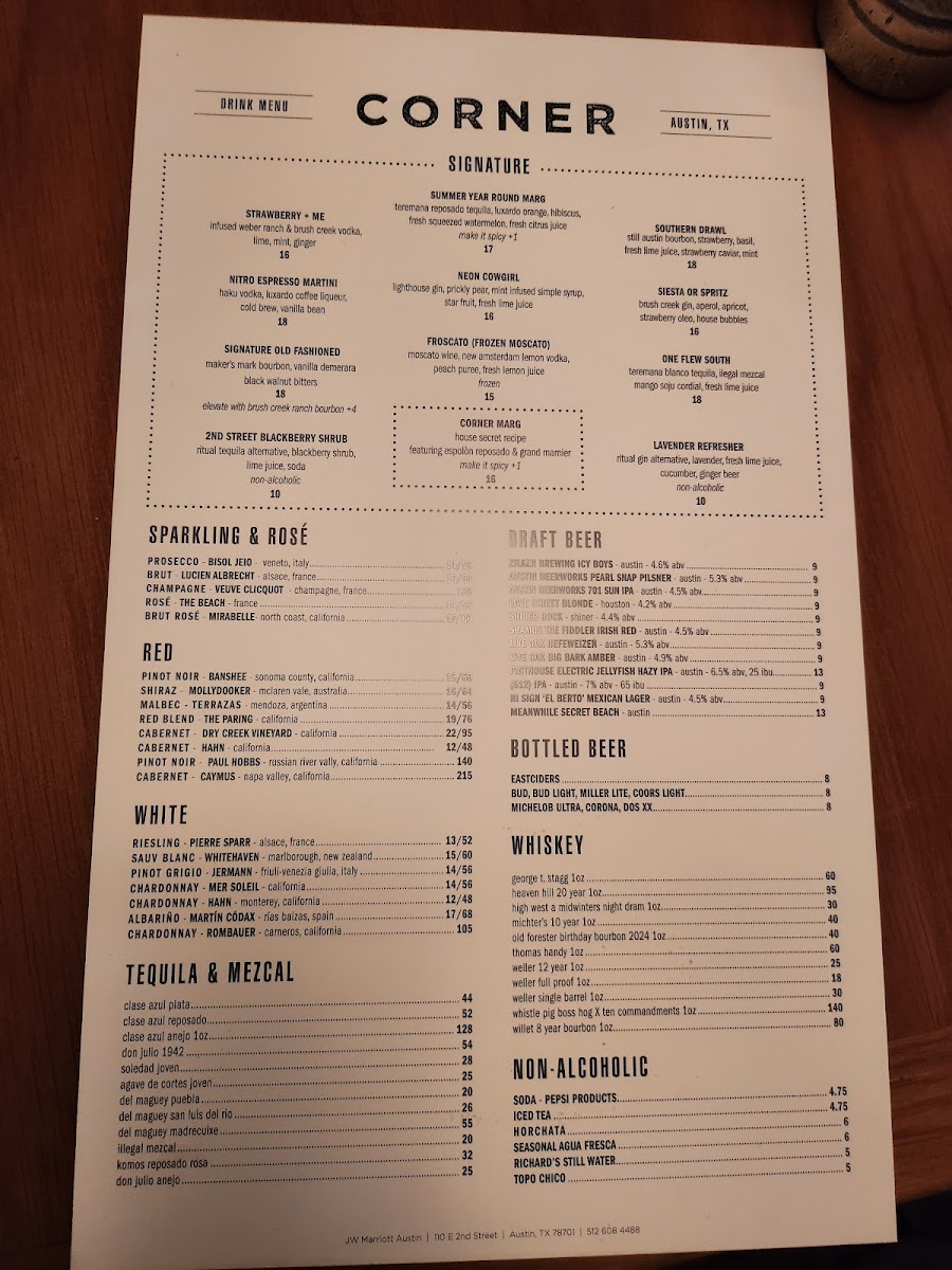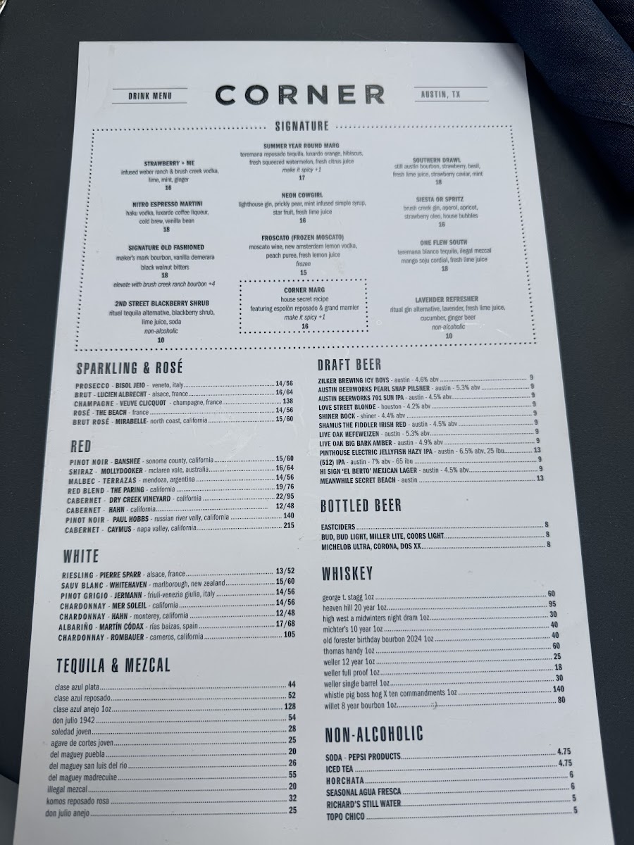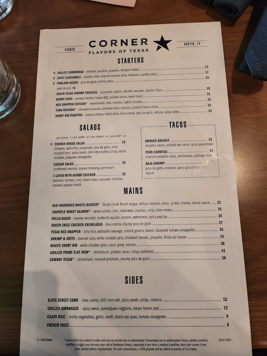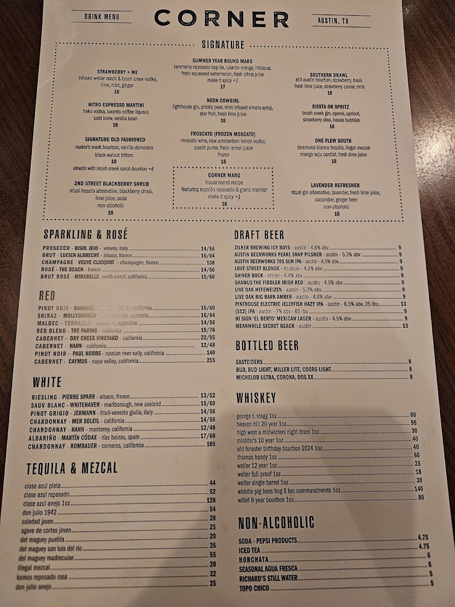 As the sun sets, the Corner transitions into dinner mode, featuring robust flavors that cater to every palate. The 7 Layer Salad with Adobo Chicken, combining Romaine, roasted tomatoes, corn, and cheddar, is as visually stunning as it is delicious. If you're in the mood for something uniquely Texan, try the Burnt Ends—smoked brisket served with house BBQ that promises to delight meat lovers. Accompany your meal with their flavorful Cajun Rice or Elote Street Corn to elevate your dining experience.