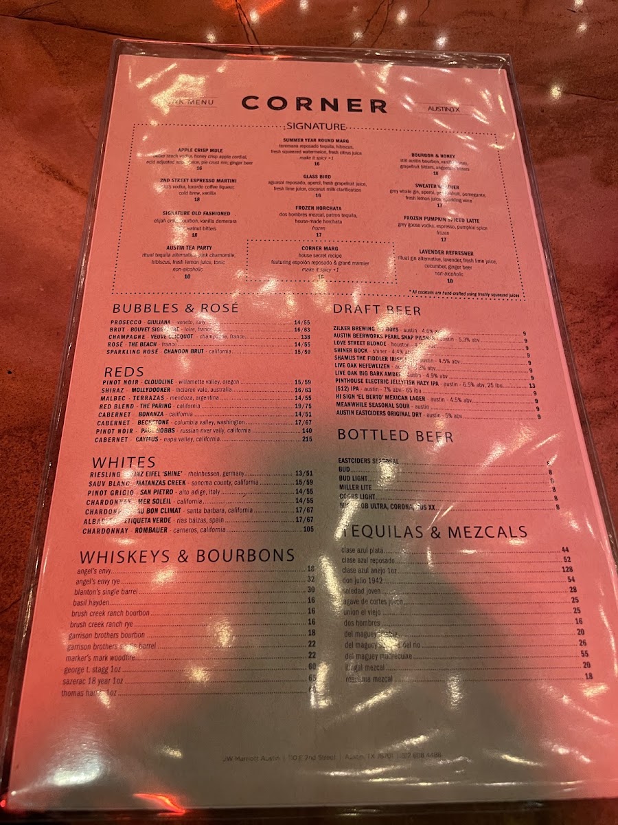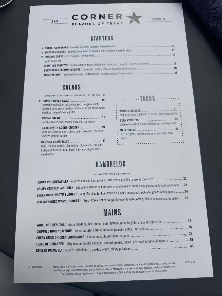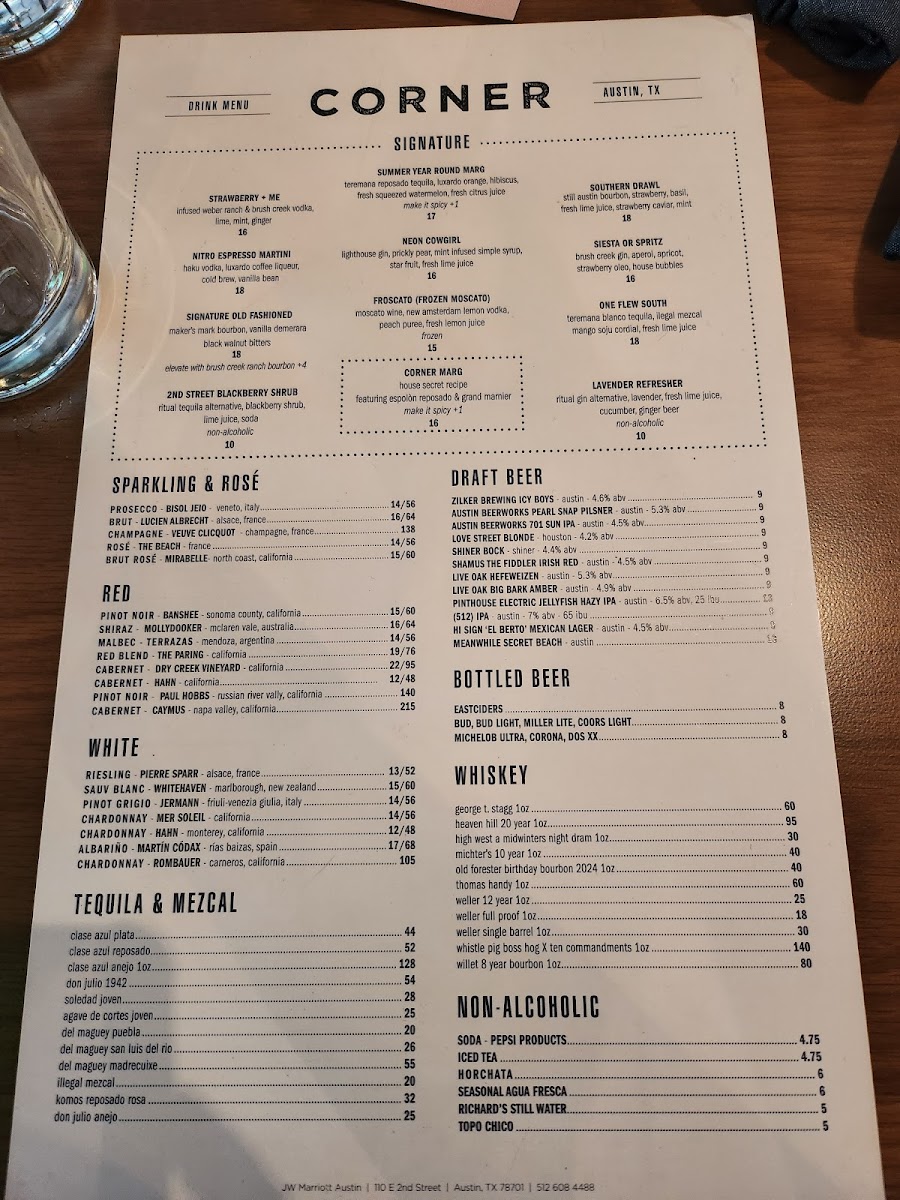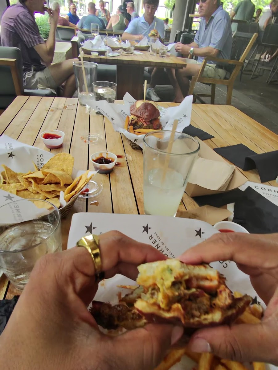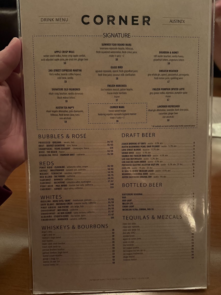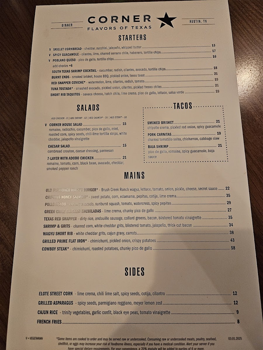 As the sun sets, the Corner transitions into dinner mode, featuring robust flavors that cater to every palate. The 7 Layer Salad with Adobo Chicken, combining Romaine, roasted tomatoes, corn, and cheddar, is as visually stunning as it is delicious. If you're in the mood for something uniquely Texan, try the Burnt Ends—smoked brisket served with house BBQ that promises to delight meat lovers. Accompany your meal with their flavorful Cajun Rice or Elote Street Corn to elevate your dining experience.